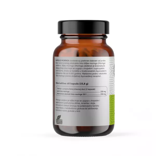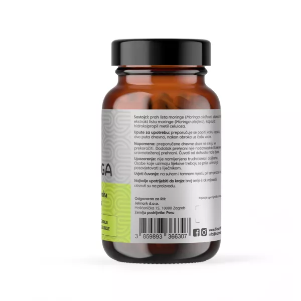 Bioandina Moringa kapsule predstavljaju jedinstvenu formulu koja kombinira cjeloviti prah lista moringe i atomizirani ekstrakt lista moringe (Moringa oleifera), pružajući maksimalnu snagu i učinkovitost u jednoj kapsuli. Zahvaljujući pažljivo osmišljenom omjeru, jedna kapsula odgovara čak 3.465 mg praha suhe tvari moringe, osiguravajući visoku nutritivnu vrijednost u praktičnom obliku. Atomizirani ekstrakt doprinosi boljoj bioraspoloživosti, dok prirodni prah lista zadržava puni spektar biljnih spojeva, čime se postiže učinkovitija apsorpcija i optimalna iskoristivost hranjivih tvari. Zbog svog impresivnog sadržaja bioaktivnih supstanci ima niz blagotvornih djelovanja na organizam. Djeluje protuupalno, antioksidativno, antibakterijski, antifungalno, antivirusno i analgetsko. Povoljno utječe na razinu kolesterola i triglicerida, te na razinu glukoze u krvi.Tradicionalno se koristila za prevenciju i smanjenje anemije. Doprinosi održavanju normalne razine glukoze. Moringa (Moringa oleifera) je svestrana biljka koja se uzgaja u tropskim i suptropskim područjima, a njezino se lišće smatra najvrjednijim dijelom biljke. Ono prirodno sadrži biljne proteine, beta-karoten (prekursor vitamina A), vitamine C i E, folnu kiselinu, kao i važne minerale poput kalcija, željeza, magnezija, mangana i kalija. Lišće moringe obiluje i antioksidansima, osobito polifenolima poput kvercetina, kempferola i klorogenske kiseline, koji se povezuju s njezinim povoljnim nutritivnim svojstvima. Uz to, sadrži i glukozinolate, biljne spojeve koji su predmet brojnih znanstvenih istraživanja.
