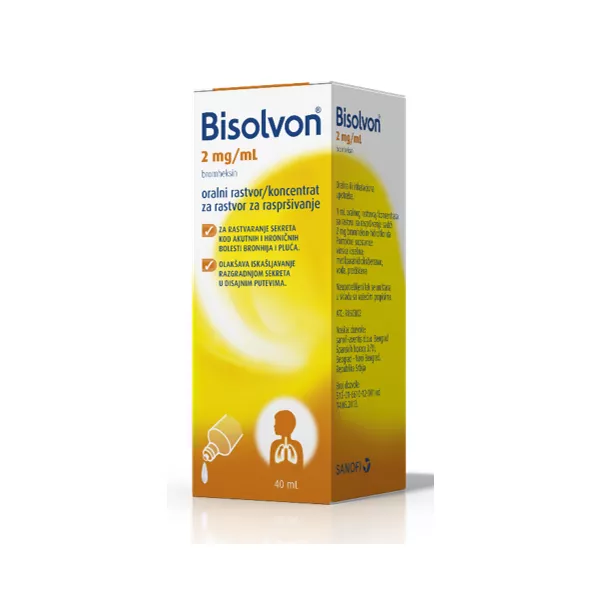 U grlu bočice nalazi se kapaljka. U pakiranju se nalazi i dozirna čašica (s mjernim oznakama od 1 do 6 ml). 1 ml Bisolvon oralne otopine sadrži 2 mg bromheksinklorida što odgovara 15 kapi. Za oralnu primjenu : Djeca mlađa od 2 godine uzimaju 0,7 ml (10 kapi) 3 puta dnevno do maksimalno 2 ml (30 kapi) na dan. Djeca od 2 do 6 godina uzimaju 1,3 ml (20 kapi) 3 puta dnevno do maksimalno 4 ml (60 kapi) na dan. Djeca iznad 6 do 12 godina uzimaju 2 ml (30 kapi) 3 puta dnevno do maksimalno 6 ml (90 kapi) na dan. Odrasli i djeca starija od 12 godina uzimaju 4 ml (60 kapi) 3 puta dnevno do maksimalno 12 ml (180 kapi)* na dan. Na početku liječenja, isključivo nakon konzultacije s liječnikom, u teškim slučajevima u odraslih je moguće povisiti najveću dnevnu dozu na 24 ml. Primjena u djece mlađe od 2 godine uz prethodnu preporuku i nadzor liječnika. Bisolvon koncentrat za otopinu za atomizator, prije inhalacije, zagrijte na tjelesnu temperaturu. Odmjerite odgovarajuću količinu koncentrata za otopinu za atomizator s priloženim mjeračem (ml) ili pomoću kapanja i inhalirajte pomoću atomizatora! Prije primjene koncentrat za otopinu za atomizator razrijedite s fiziološkom otopinom u omjeru 1 : 1. Kako biste izbjegli stvaranje čestica u razrijeđenoj otopini, inhalirajte otopinu lijeka Bisolvon odmah nakon pripreme. Primjena u dišne puteve (razrijeđeno s fiziološkom otopinom) : Djeca mlađa od 2 godine uzimaju 0,3 ml (5 kapi) 2 puta dnevno do maksimalno 0,7 ml (10 kapi) na dan. Djeca od 2 do 6 godina uzimaju 0,7 ml (10 kapi) 2 puta dnevno do maksimalno 1,3 ml (20 kapi) na dan. Djeca iznad 6 do 12 godina uzimaju 1 ml (15 kapi) 2 puta dnevno do maksimalno 2 ml (30 kapi) na dan. Djeca starija od 12 godina uzimaju 2 ml (30 kapi) 2 puta dnevno do maksimalno 4 ml (60 kapi) na dan. Odrasli uzimaju 4 ml (60 kapi) 2 puta dnevno do maksimalno 8 ml (120 kapi) na dan.