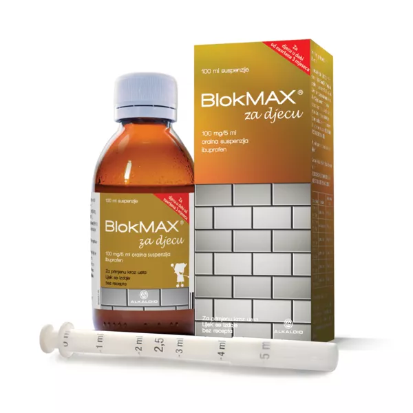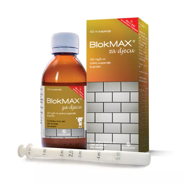 Najnižu učinkovitu dozu potrebno je primjenjivati tijekom najkraćeg razdoblja potrebnog za ublažavanje simptoma. Ako imate infekciju, odmah se obratite liječniku ako simptomi (kao što su vrućica i bol) ustraju ili se pogoršaju. Osobama s osjetljivim želucem preporučuje se uzimanje lijeka BlokMAX za djecu s hranom. Doze treba davati svakih 6 – 8 sati. Razdoblje između doza treba biti najmanje 4 sata. Koliko će biti vremensko razdoblje između doza, treba odlučiti na temelju simptomima. Najveća dnevna doza se ne smije prekoračiti. Preporučena doza za djecu u dobi od 3 do 6 mjeseci (5-7,6 kg) je 2,5 ml (50 mg), 3 puta dnevno. Maksimalna dnevna doza je 7,5 ml (150 mg). Preporučena doza za djecu u dobi od 6 do 12 mjeseci (7,7 – 9 kg) je 2,5 ml (50 mg), 3-4 puta dnevno. Maksimalna dnevna doza je 7,5-10 ml (150 -200 mg). Preporučena doza za djecu u dobi od 1 do 3 godine (10 – 15 kg) je 5 ml (100 mg), 3 puta dnevno. Maksimalna dnevna doza je 15 ml (300 mg). Preporučena doza za djecu u dobi od 4 do 6 godina (16 – 20 kg) je 7,5 ml (150 mg), 3 puta dnevno. Maksimalna dnevna doza je 22,5 ml (450 mg). Preporučena doza za djecu u dobi od 7 do 9 godina (21 – 29 kg) je 10 ml (200 mg), 3 puta dnevno. Maksimalna dnevna doza je 30 ml (600 mg). Preporučena doza za djecu u dobi od 10 do 12 godina (30 – 40 kg) je 10 ml (200 mg), 4 puta dnevno. Maksimalna dnevna doza je 40 ml (800 mg). Najveća dnevna doza se ne smije prekoračiti.