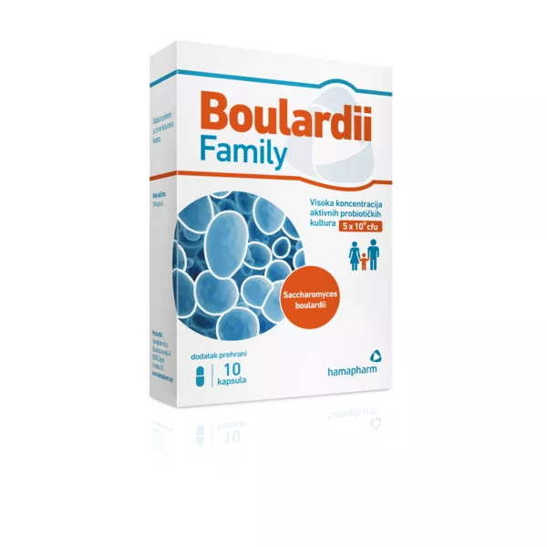 Boulardii Family je dodatak prehrani koji sadrži Saccharomyces Boulardii s 5 milijardi živih stanica kvasca. Prikladan je tijekom i nakon antibiotske terapije. Namijenjen za cijelu obitelj. Ne sadrži gluten.