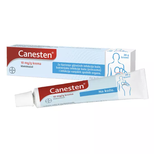 Canesten krema primjenjuje se za liječenje: Gljivične infekcije kože stopala (tinea pedum ili »atletsko stopalo«) i ruku (tinea manuum). Infekcija uzrokuje ljuštenje, pojavu mjehurića i odumiranje kože na stopalima, dlanovima i između prstiju. Na oboljelim dijelovima koža je raspucala, mogu se pojaviti svrbež, upala i oteklina. Gljivične infekcije kože na trupu, udovima, kožnim pregibima (tinea corporis) i u preponama (tinea inguinalis). Infekcija se najčešće očituje kao pojava ovalnih crvenih mrlja koje se šire i na sredini su svjetlije. Gljivične infekcije kože nazvane pityriasis versicolor. Infekcija uzrokuje nastanak mrlja sa sitnim ljuskama svjetlije, tamnije, žutosmeđe ili ružičaste boje, može se pojaviti i gubitak kožnoga pigmenta (depigmentacija). Infekcije vanjskih spolnih organa gljivicama iz roda Candida u žena i muškaraca. Kod žena se infekcija vanjskih spolnih organa (kandidni vulvitis)očituje kao svrbež, pocrvenjelost, otečenost, pekuće ranice stidnih usana i dijelova oko njih. Kod muškaraca se ta infekcija (kandidni balanitis) očituje kao sitan bijeli osip, svrbež i blaga upala glavića i kožice spolnog uda; Bakterijske infekcije kože nazvane eritrazma.