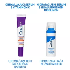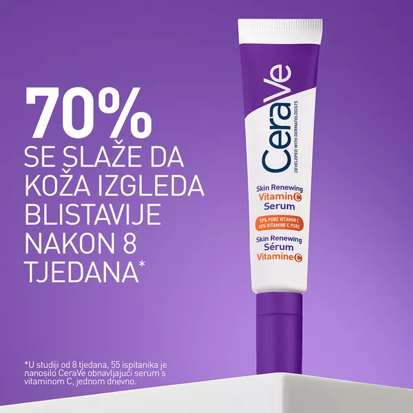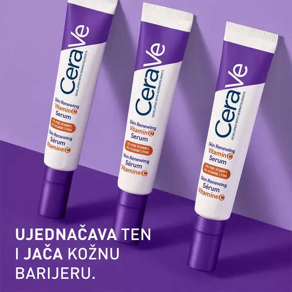 Ujednačava ten i jača kožnu barijeru. Sadrži 3 esencijalna ceramida, hijaluronsku kiselinu i vitamin B5. 10% ČISTI VITAMIN C. 70% SE SLAŽE DA KOŽA IZGLEDA BLISTAVIJE nakon 8 tjedana* *U studiji od 8 tjedana, 55 ispitanika je nanosilo CeraVe obnavljajući serum s vitaminom C, jednom dnevno.