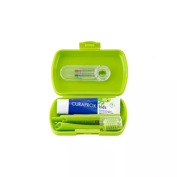 Curaprox Kids Putni Set za zdrav i blistav osmijeh vašeg mališana. Ovaj praktičan set sadrži sve što je potrebno za kvalitetnu oralnu higijenu: putnu četkicu za zube s 5 500 ultra mekanih Curen® vlakana, malu putnu pastu za zube s fluoridima (10 ml i s okusom mentola) i dvije veličine međuzubnih četkica CPS prime (CPS 06 i 07). Posebno je dizajniran za djecu od 6 do 12 godina i s mogućnošću refilla kako bi svaka tri mjeseca ili prema potrebi zamijenili glavu četkice, pastu za zube ili međuzubne četkice. Veseli dizajn nudi personalizaciju seta uz priložene zabavne naljepnice. Savršen za obiteljske odmore, školske praznike, druženja s prijateljima, kao i svakodnevnu upotrebu. Curaprox Kids putni set za 100% čiste zube, čak i u pokretu. Proizveden u Švicarskoj, vrhunske Curaprox kvalitete, za mlade istraživače pruža najbolje praktično rješenje do zdravog i blistavog osmijeha. Što sadrži Kids Putni Set? 1x sklopiva dječja četkica za zube 1x dječja pasta za zube od 10 ml s okusom blagog mentola Duo držač s međuzubnim četkicama u veličinama 06 i 07 zabavne naljepnice za jedinstvenu personalizaciju svakog putnog seta Čisti međuzubni prostori iznimno su važni za oralno zdravlje, kako odraslih, tako i djece. Međuzubne četkice mogu se svakodnevno koristiti već od 6. godine. Preporučujemo da roditelji čiste zube djeci u dobi od 6 do 10 godina. Za stariju djecu preporučujemo i nadalje roditeljski nadzor kako bi usvojili pravilnu tehniku četkanja i održavali kvalitetnu oralnu higijenu u budućnosti. Djeci koja do sada još nisu koristila međuzubnu četkicu u početku će zasigurno krvariti desni. To nije razlog za brigu nego znak da postoji upala desni koju je moguće umanjiti svakodnevnom i pravilnom upotrebom međuzubnih četkica. Dovoljno je očistiti svaki međuzubni prostor jednom na dan, jednom unutra i van - gotovo! U većini slučajeva uočljivo je značajno poboljšanje i smanjenje krvarenja unutar 3 do 7 dana redovite upotrebe. Malen i praktičan set za savršenu oralnu higijenu dječjih zuba, svakog dana i bilo gdje.