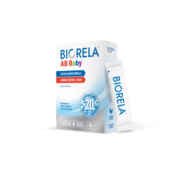 Biorela® AB Baby je dodatak prehrani za povećanje broja dobrih* bakterija u probavnom sustavu pogodan za djecu već od dojenačke dobi. Za brze rezultate, snažna doza premium kombinacije s više od 20 milijardi dobrih* bakterija uz dodatak inulina za uzimanje kod antibiotika. Dolazi u obliku praha u vrećici, a namijenjena je dojenčadi, djeci i odraslima. Sadrži dobre* bakterije koje se prirodno nalaze u našim crijevima. Formulirana je tako da bakterijske kulture žive dolaze do crijeva i tamo učinkovito povećavaju broj bifidobakterija i laktobacila. Pri korištenju uz antibiotik, proizvod uzeti 1 sat prije ili 3 sata nakon uzimanja antibiotika. *nepatogene bakterije prirodno prisutne u probavnom sustavu