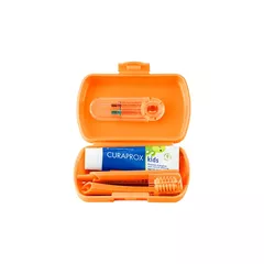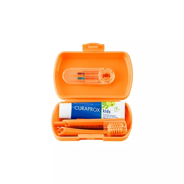 Curaprox Kids Putni Set za zdrav i blistav osmijeh vašeg mališana. Ovaj praktičan set sadrži sve što je potrebno za kvalitetnu oralnu higijenu: putnu četkicu za zube s 5 500 ultra mekanih Curen® vlakana, malu putnu pastu za zube s fluoridima (10 ml i s okusom mentola) i dvije veličine međuzubnih četkica CPS prime (CPS 06 i 07). Posebno je dizajniran za djecu od 6 do 12 godina i s mogućnošću refilla kako bi svaka tri mjeseca ili prema potrebi zamijenili glavu četkice, pastu za zube ili međuzubne četkice. Veseli dizajn nudi personalizaciju seta uz priložene zabavne naljepnice. Savršen za obiteljske odmore, školske praznike, druženja s prijateljima, kao i svakodnevnu upotrebu. Curaprox Kids putni set za 100% čiste zube, čak i u pokretu. Proizveden u Švicarskoj, vrhunske Curaprox kvalitete, za mlade istraživače pruža najbolje praktično rješenje do zdravog i blistavog osmijeha. Što sadrži Kids Putni Set? 1x sklopiva dječja četkica za zube 1x dječja pasta za zube od 10 ml s okusom blagog mentola Duo držač s međuzubnim četkicama u veličinama 06 i 07 zabavne naljepnice za jedinstvenu personalizaciju svakog putnog seta Čisti međuzubni prostori iznimno su važni za oralno zdravlje, kako odraslih, tako i djece. Međuzubne četkice mogu se svakodnevno koristiti već od 6. godine. Preporučujemo da roditelji čiste zube djeci u dobi od 6 do 10 godina. Za stariju djecu preporučujemo i nadalje roditeljski nadzor kako bi usvojili pravilnu tehniku četkanja i održavali kvalitetnu oralnu higijenu u budućnosti. Djeci koja do sada još nisu koristila međuzubnu četkicu u početku će zasigurno krvariti desni. To nije razlog za brigu nego znak da postoji upala desni koju je moguće umanjiti svakodnevnom i pravilnom upotrebom međuzubnih četkica. Dovoljno je očistiti svaki međuzubni prostor jednom na dan, jednom unutra i van - gotovo! U većini slučajeva uočljivo je značajno poboljšanje i smanjenje krvarenja unutar 3 do 7 dana redovite upotrebe. Malen i praktičan set za savršenu oralnu higijenu dječjih zuba, svakog dana i bilo gdje.