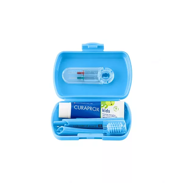 Curaprox Kids Putni Set za zdrav i blistav osmijeh vašeg mališana. Ovaj praktičan set sadrži sve što je potrebno za kvalitetnu oralnu higijenu: putnu četkicu za zube s 5 500 ultra mekanih Curen® vlakana, malu putnu pastu za zube s fluoridima (10 ml i s okusom mentola) i dvije veličine međuzubnih četkica CPS prime (CPS 06 i 07). Posebno je dizajniran za djecu od 6 do 12 godina i s mogućnošću refilla kako bi svaka tri mjeseca ili prema potrebi zamijenili glavu četkice, pastu za zube ili međuzubne četkice. Veseli dizajn nudi personalizaciju seta uz priložene zabavne naljepnice. Savršen za obiteljske odmore, školske praznike, druženja s prijateljima, kao i svakodnevnu upotrebu. Curaprox Kids putni set za 100% čiste zube, čak i u pokretu. Proizveden u Švicarskoj, vrhunske Curaprox kvalitete, za mlade istraživače pruža najbolje praktično rješenje do zdravog i blistavog osmijeha. Što sadrži Kids Putni Set? 1x sklopiva dječja četkica za zube 1x dječja pasta za zube od 10 ml s okusom blagog mentola Duo držač s međuzubnim četkicama u veličinama 06 i 07 zabavne naljepnice za jedinstvenu personalizaciju svakog putnog seta Čisti međuzubni prostori iznimno su važni za oralno zdravlje, kako odraslih, tako i djece. Međuzubne četkice mogu se svakodnevno koristiti već od 6. godine. Preporučujemo da roditelji čiste zube djeci u dobi od 6 do 10 godina. Za stariju djecu preporučujemo i nadalje roditeljski nadzor kako bi usvojili pravilnu tehniku četkanja i održavali kvalitetnu oralnu higijenu u budućnosti. Djeci koja do sada još nisu koristila međuzubnu četkicu u početku će zasigurno krvariti desni. To nije razlog za brigu nego znak da postoji upala desni koju je moguće umanjiti svakodnevnom i pravilnom upotrebom međuzubnih četkica. Dovoljno je očistiti svaki međuzubni prostor jednom na dan, jednom unutra i van - gotovo! U većini slučajeva uočljivo je značajno poboljšanje i smanjenje krvarenja unutar 3 do 7 dana redovite upotrebe. Malen i praktičan set za savršenu oralnu higijenu dječjih zuba, svakog dana i bilo gdje.