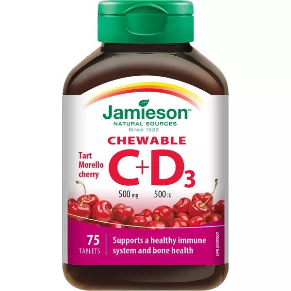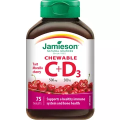 Jamieson Vitamin C+D tablete za žvakanje s okusom prirodne trešnje je dodatak prehrani za podršku imunološkog sustava. Dva važna vitamina – vitamini C i D u obliku tableta za žvakanje s prirodnim okusom trešnje. Pridonose funkciji imunološkog sustava, očuvanju i razvoju kostiju i zuba, a izvor antioksidansa pridonosi očuvanju zdravlja. Ne sadrži soli, škrob, gluten, laktozu, umjetne boje, okuse i konzervanse. Proizvod nije primjeren za vegane.