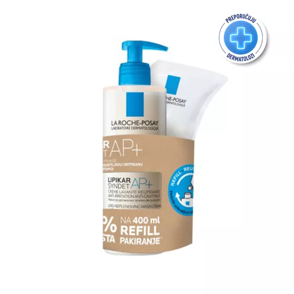 La Roche-Posay Lipikar Syndet AP+ Kremasti gel za tuširanje protiv nadraženosti i svrbeža, 400 ml + Refill pakiranje 400 ml. Krema za pranje namijenjena novorođenčadi, dojenčadi, djeci i odraslima koji imaju kožu sklonu atopiji. Prikladna za osjetljivu kožu sklonu svrbežu. Prikladno za tjeme male djece oboljele od seboroičnog dermatitisa. UMIRUJE: Trenutno umiruje i ublažava iznimnu suhoću već nakon tuširanja. HIDRATIZIRA: Hidratizira i umiruje nadraženu kožu te smiruje svrbež.ISPITANO: Ispitali pacijenti koji se liječe od raka radi povećanja osjećaja ugode na koži