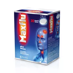 Maxflu je kombinirani lijek, koji sadrži tri djelatne tvari: paracetamol, pseudoefedrinklorid i askorbatnu kiselina (vitamin C). Paracetamol je lijek za uklanjanje bolova i snižavanje tjelesne temperature. Pseudoefedrin je dekongestiv koji smanjuje oteknuće sluznice nosa i sinusa, pomaže otkloniti začepljenost nosa i čini sinuse prohodnima te time olakšava disanje. Askorbatna kiselina (vitamin C) zadovoljava povećane potrebe organizma za tim vitaminom tijekom prehlade i gripe. Djelovanje započinje oko pola sata nakon uzimanja lijeka i traje četiri do šest sati. Maxflu je namijenjen kod odraslih i djece starije od 12 godina za kratkotrajno ublažavanje simptoma uzrokovanih običnom prehladom i gripom: povišene tjelesne temperature, oteknuća sluznice nosa i sinusa i/ili sinusne boli, glavobolje, grlobolje, mišićne boli.
