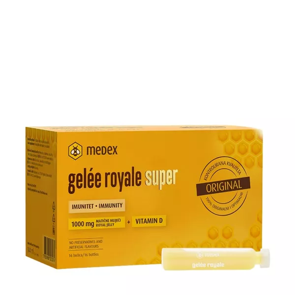 Gelée royale super je osmišljen za sve koji žele da njihovo tijelo lakše prati brzi tempo života. Gelée royale super u praktičnim bočicama čuva kompleksni prirodni sastav matične mliječi i jednostavan je za uzimanje. Jedna bočica sadrži 1000 mg matične mliječi s dodanim vitaminom D. Vitamin D doprinosi normalnoj funkciji imunološkog sustava, a zovu ga i »vitamin sunca«. To je jedan od rijetkih vitamina koje naše tijelo može proizvoditi samo, što nije slučaj u jesensko-zimskim mjesecima kada smo mnogo manje izloženi sunčevim zrakama. Zato je preporučljivo da ga tada u svoje tijelo unosite odgovarajućom prehranom ili u obliku dodataka. Vitamin D je ključan tijekom cijeloga života i stručnjaci upozoravaju kako smo premalo svjesni važnosti vitamina D, a njegov je nedostatak u tijelu pojedinaca sve rašireniji. Proizvodom Gelée royale super vaša će prehrana biti kvalitetnija, a svakodnevni izazovi lakši. Zato ga počnite uzimati već danas i pobrinite se za prirodnu zaštitu svog imunološkog sustava i dobrobiti organizma.