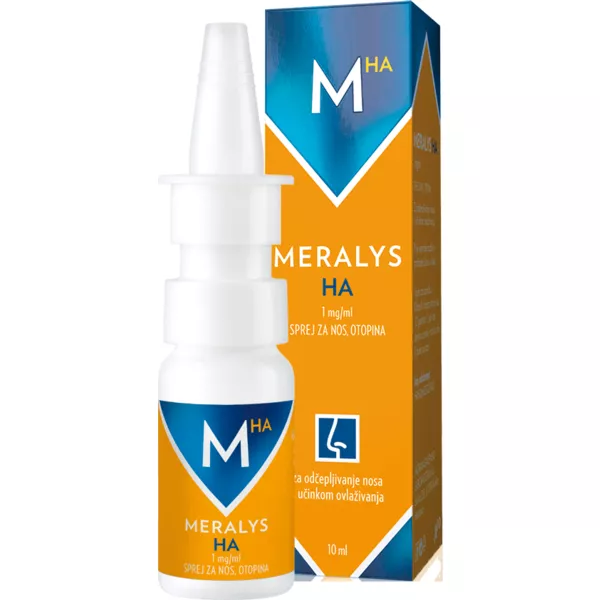 Meralys HA 1 mg/ml sprej za nos sadrži djelatnu tvar ksilometazolinklorid koji pripada skupini lijekova koji se nazivaju simpatomimetici. Ksilometazolinklorid pomaže sužavanju krvnih kapilara u Vašem nosu smanjujući time oteknuće sluznice nosa, čime se olakšava disanje. Meralys HA 1 mg/ml sprej za nos također sadrži hijaluronsku kiselinu (u obliku natrijevog hijaluronata) koja štiti i vlaži sluznicu nosa. Koristi se za: - smanjenje otečenosti sluznice nosa uzrokovane upalom sluznice sinusa (sinusitisom) ili upalom sluznice nosa (rinitisom). Meralys HA 1 mg/ml sprej za nos, otopina primjenjuje se za liječenje odraslih i adolescenata starijih od 12 godina.