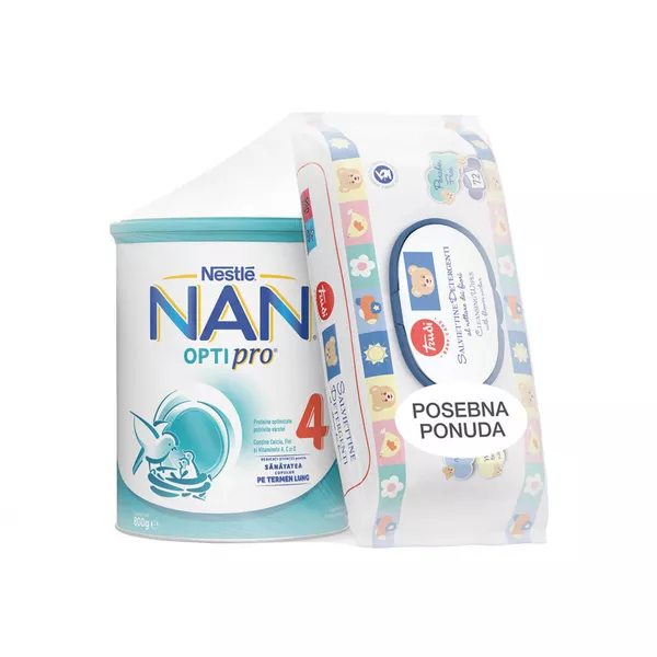 NAN OPTIPRO® 4 je mliječni pripravak namijenjen maloj djeci uzrasta od navršene 2 godine, kao tekući dio prehrane. OPTIPRO®: Optimizirane bjelančevine sukladno dobi djeteta, kako u kvalitativnom tako i u kvantitativnom pogledu. Vitamin D pridonosi normalnoj funkciji imunološkog sustava u djece. Kalcij je potreban za normalan rast i razvoj dječjih kostiju. Željezo je potrebno za normalan kognitivni razvoj djece. Raznovrsna i uravnotežena prehrana i zdrav način života su važni za zdravlje Vašeg djeteta. Uz raznovrsnu prehranu i konzumaciju jednog obroka NAN OPTIPRO® 4 dnevno može se osigurati potreban unos vitamina D, kalcija i željeza. Upitajte svog liječnika specijalistu o mlijeku za malu djecu NAN® OPTIPRO® 4. Jeste li znali da većina djece nakon 2 godine starosti općenito konzumira više bjelančevina nego što im je potrebno? Bjelančevine se sastoje od aminokiselina. Neke od njih tijelo ne može samo proizvesti, a apsolutno su nužne za normalan rast i razvoj. One se nazivaju esencijalnim aminokiselinama, a kvaliteta bjelančevine određuje se njihovom prisutnošću i količinama u kojima su prisutne u određenoj bjelančevini. Istraživanja su pokazala da je kvaliteta i količina bjelančevina važna za normalan rast i razvoj djece, budući da su bjelančevine građevinski materijal stanica.