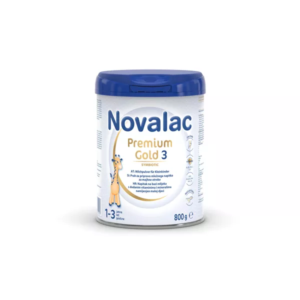 Novalac Premium Gold 3 napitak na bazi mlijeka namijenjen je maloj djeci od 1. do 3. godine života kao dio raznolike i uravnotežene prehrane. Pripremljeni obrok (jedna bočica napitka Novalac Premium Gold 3) sadrži kalcij i vitamin D (potrebni za normalan rast i razvoj kostiju u djece), izvor je vitamina B1, B2, B12, C, D, E i biotina te je bogat vitaminom K1. Novalac Premium Gold 3 napitak na bazi mlijeka obogaćen je i hranjivim tvarima za crijevne bakterije GOS, korisnim bakterijama B. lactis i nukleotidima. Sinergistička kombinacija hranjivih tvari za crijevne bakterije može poboljšati probavnu lagodnost i kvalitetu života te može povećati razinu bifidobakterija u stolici. Novalac Premium Gold 3 primjeren je za nastavak hranjenja nakon upotrebe Novalaca Premium Gold 2 ili bilo koje druge prijelazne mliječne hrane.Linija proizvoda Novalac Premium Gold dostupna je u praktičnom pakiranju. U poklopcu se nalazi prostor u koji možete pohraniti mjericu za sljedeći put. Ugrađeni držač mjerice čini pripremu mlijeka higijenskijom i bez nereda. Mjerica se lako može izvaditi iz držača, što omogućuje precizno doziranje bez prskanja i time čišću i higijenskiju pripremu obroka.