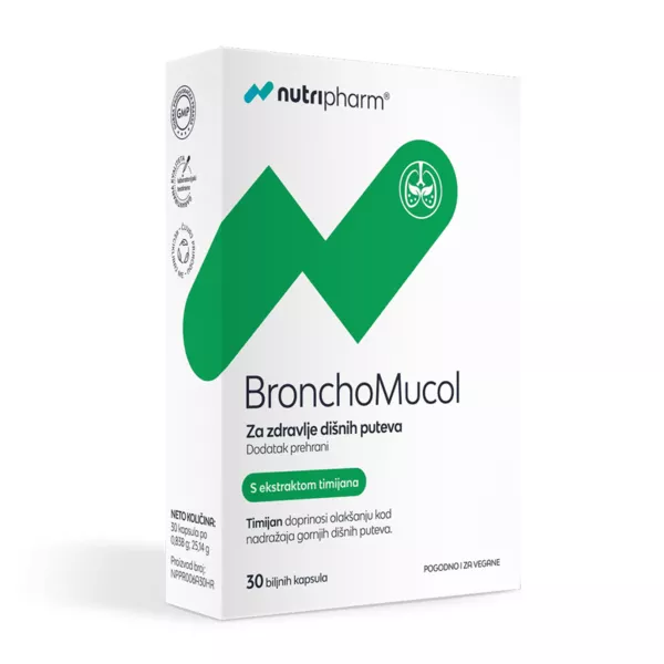 BronchoMucol® u obliku kapsula donosi ti olakšanje kada ti je to najpotrebnije – za vrijeme sastanka, svakodnevnih aktivnosti i slobodnog vremena. Posebna formula trostrukog učinka smiruje i štiti dišne puteve i pomaže ti da se ponovno prepustiš udahu bez napora. Olakšaj svaki udah, neka on postane svjež, lagan i energičan! Nutripharm® BronchoMucol® kapsule napredan su dodatak prehrani koji sadrži vrhunsku sinergijsku formulu – u jednoj kapsuli sadrži 600 mg N-acetilcisteina, nadopunjenog bromelainom i ekstraktom timijana (Thymus vulgaris).