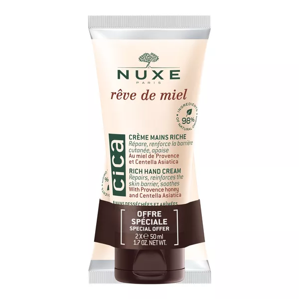Reve de Miel Cica Rich krema od Nuxe-a obnavlja i jača zaštitnu barijeru kože, posebno dizajnirana za suhe i oštećene ruke. Izrađena je od 98% prirodnih sastojaka, uključujući lavandin med iz Provanse i Centellu Asiaticu, te nježno njeguje epidermu. Uživajte u prirodnim sastojcima i učinkovitoj njezi!