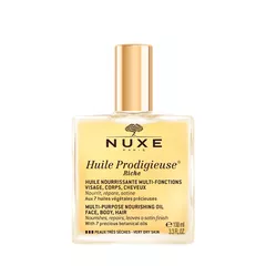 Huile Prodigieuse® Riche intenzivno i dubinski hrani te uljepšava suhu do vrlo suhu kožu. U samo jednom koraku obavija je neodoljivim, svilenkastim sjajem. Koža lica, tijela i kosa djeluju obnovljeno, meko i glatko na dodir. Vidljivost strija je smanjena, a djelotvornost je dokazana: zaštitna barijera kože poboljšava se već nakon jednog sata. Neodoljiv miris sunca i tople pješčane obale, u kombinaciji s prepoznatljivim suhim dodirom ovog ulja, obavija kožu blistavom senzualnošću. Uživaj u njegovom suptilnom, omamljujućem mirisu na koži i kosi. Za izradu Huile Prodigieuse® Riche ulja, NUXE je odabrao 7 dragocjenih ulja 100 % biljnog podrijetla: tsubaki, arganovo, makadamijino (u većoj količini nego u originalnoj verziji), ulje boražine, kamelije, lješnjaka i slatkog badema.