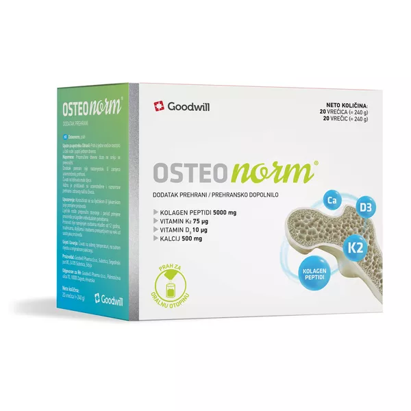 Aktivni sastav 100g 1 vrećica %NRV*: Hidrolizirani govedi peptidi kolagena 41.67 g 5000 mg - Kalcij (u obliku topljivog kalcijeva laktata) 4,17 g 500 mg 62,5% Vitamin D3 (kolekalciferol 0,08 mg 10 µg 200% MK-7 (menakinan) 0,63 mg 75 µg 100% "Nutritivne referentne vrijednosti Uporaba: Odrasli 1 vrećica dnevno. -Sadržaj jedne vrećice dobro otopiti u čaši vode i popiti.