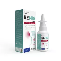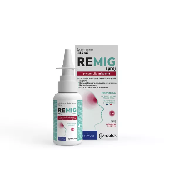 REMIG je tekući filmogeni flaster za prevenciju migrene. Kada se REMIG sprej primijeni na površinu nosne sluznice, stvara se rezistentni polimerni film s osmotskim djelovanjem. Hipertonično djelovanje REMIG SPREJA trenutno izvlači tekućinu prisutnu u tkivu sluznice, stvarajući izlazni tok tekućine. Ovim mehaničkim djelovanjem pomaže izdvajanju i uklanjanju tvari koje su specifčno uključene u pokretanje migrene, poput CGRP-a i drugih upalnih proteina (interleukini 6 i 12) prisutnih na površini sluznice nosa. Osmotski film REMIG spreja djeluje lokalno, mehanički, bez sistemske apsorpcije i tijekom 4 do 6 sati nakon svake primjene. Klinički podaci pokazali su da redovita uporaba REMIG spreja značajno smanjuje učestalost i intenzitet migrene te poboljšava kvalitetu života.