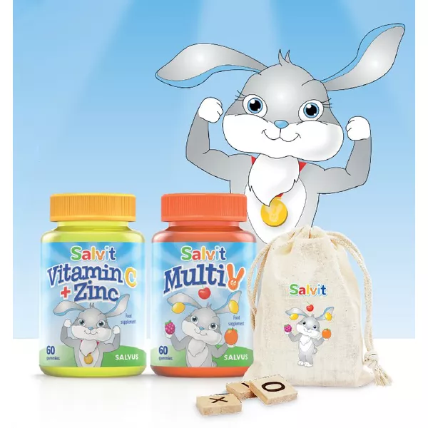 Salvit Paket + Igračka kombinira multivitaminski kompleks i edukativnu igračku. MultiV žele bomboni sadrže 100% preporučenog dnevnog unosa 8 vitamina, a vitamin C i cink podupiru imunitet. Edukativna igra brojanja pomaže djeci predškolske i školske dobi razvijati koncentraciju, pamćenje i matematičke vještine kroz zabavu.