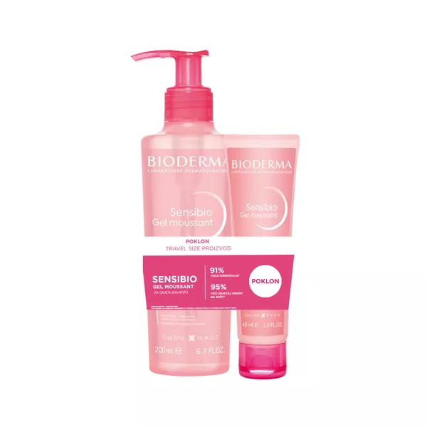 Bioderma Sensibio Gel Moussant – Promo Pakiranje 200 ml + 45 ml Bioderma Sensibio Gel Moussant nježni je pjenasti gel za čišćenje lica namijenjen osjetljivoj koži, a sada dolazi u praktičnom promo pakiranju: veliki 200 ml gel i mini verzija od 45 ml, idealna za torbu ili putovanja, po specijalnoj cijeni. Ovaj gel učinkovito uklanja nečistoće i ostatke šminke, a istovremeno čuva prirodnu ravnotežu kože. Formuliran prema principima ekobiologije, pruža temeljito, ali vrlo nježno čišćenje bez iritacija, uz pomoć D.A.F.™ (Dermatological Advanced Formulation) kompleksa koji povećava prag tolerancije kože i smanjuje njezinu osjetljivost. Blagi surfaktanti nježno uklanjaju nečistoće, višak sebuma i šminku s lica i očiju, bez narušavanja zaštitne kožne barijere. Koža ostaje čista, svježa i ugodna, bez osjećaja zatezanja ili isušivanja. Lagana gel tekstura pretvara se u mekanu pjenu koja se lako ispire. Prednosti promo pakiranja: • Velika 200 ml boca za svakodnevnu njegu kod kuće • Travel size 45 ml verzija za putovanja ili torbu Rezultati: Koža je temeljito očišćena i osvježena, osjetljiva koža ostaje umirena, meka i ugodna. Redovitom uporabom koža postaje uravnoteženija i otpornija.