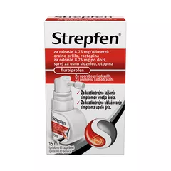 Djelatna tvar je flurbiprofen. Flurbiprofen pripada grupi lijekova koji se nazivaju nesteroidni protuupalni lijekovi (NSAIL) koji djeluju tako da mijenjaju reakciju tijela na bol, oticanje i povišenu tjelesnu temperaturu. Strepfen sprej se koristi kod odraslih u dobi od 18 godina i starijih za kratkotrajno ublažavanje simptoma upale grla kao što su nadraženost grla, grlobolja, poteškoće s gutanjem i oticanje.
