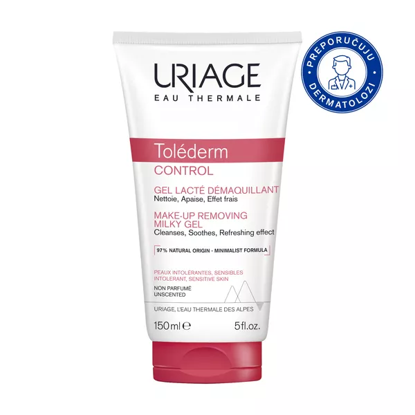 TOLEDERM CONTROL gel za za skidanje šminke s lica i očiju. Pruža trenutni i dugotrajni osjećaj ugode na koži. S minimalističkom formulom umiruje osjećaj zatezanja, peckanja nježno čisti i uklanja šminku. Posebno je dizajniran za najosjetljiviju kožu: netolerantnu, s alergijskom poviješću, itd. Proizvod umiruje i olakšava kožu u jednom koraku! Ova formula je bez mirisa, napravljena od 97% sastojaka prirodnog podrijetla i prikladna je za osobe koje nose kontaktne leće.