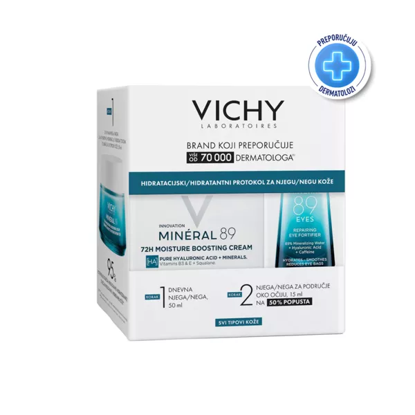 Vichy Mineral 89 Hidratacijski protokol za njegu za sve tipove kože. Promo Pakiranje sadrži Vichy Mineral 89 Bogata krema za intenzivnu hidraciju za sve tipove kože 50ml i Vichy Mineral 89 Eyes Snažnija i punija koža oko očiju s hijaluronskom kiselinom 15ml.Ovaj duo pruža dubinsku hidrataciju i jačanje kožne barijere suhe i osjetljive kože. Krema s Vichy vulkanskom vodom, hijaluronskom kiselinom, vitaminima B3 i E te skvalanom hidratizira do 100 sati, smanjuje crvenilo i vraća koži punoću. Njega za područje oko očiju s hijaluronskom kiselinom i kofeinom zaglađuje tanke bore, smanjuje natečenost i tamne podočnjake. Oba proizvoda su hipoalergena, nekomedogena i bez mirisa, idealna za svakodnevnu njegu suhe do vrlo suhe kože.