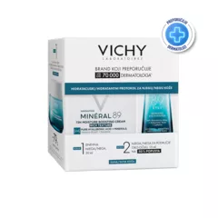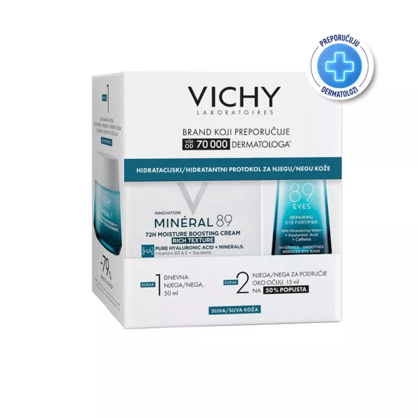 Vichy Mineral 89 Hidratacijski protokol za njegu suhe kože Promo Pakiranje sadrži Vichy Mineral 89 Bogata krema za intenzivnu hidraciju suhe do vrlo suhe kože 50ml i Vichy Mineral 89 Eyes Snažnija i punija koža oko očiju s hijaluronskom kiselinom 15ml.Ovaj duo pruža dubinsku hidrataciju i jačanje kožne barijere suhe i osjetljive kože. Krema s Vichy vulkanskom vodom, hijaluronskom kiselinom, vitaminima B3 i E te skvalanom hidratizira do 100 sati, smanjuje crvenilo i vraća koži punoću. Njega za područje oko očiju s hijaluronskom kiselinom i kofeinom zaglađuje tanke bore, smanjuje natečenost i tamne podočnjake. Oba proizvoda su hipoalergena, nekomedogena i bez mirisa, idealna za svakodnevnu njegu suhe do vrlo suhe kože.
